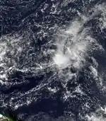 On August 18, a tropical wave moved westward off the coast of Africa. With low pressures and gradually organizing convection, Tropical Depression Four developed west of Senegal early on August 19.[34] Initially it failed to intensify due to wind shear,[34] and the center became ill-defined on August 20.[35] After passing south of Cape Verde,[36] the depression intensified into Tropical Storm Cindy as the convection became concentrated around the center.[37] Due to a strong ridge, Cindy moved westward, before turning northwestward by August 21.[38] Banding features gradually increased as outflow improved,[39] and late on August 21, Cindy became a hurricane.[40] Afterward, increased wind shear dislocated the convection from the center,[41] which weakened Cindy to a tropical storm.[42]