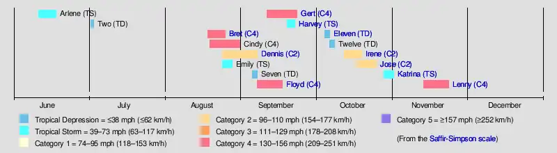 The Atlantic hurricane season officially began on June 1, 1999,[8] and the first tropical cyclone developed on June 11.[10] It was an above–average season in which 16 tropical cyclones formed.[11][12][13][14] Twelve depressions attained tropical storm status, and eight of these became hurricanes. Five hurricanes intensified further into major hurricanes.[11] The season featured a record-tying five Category 4 hurricanes,[15] later tied again in 2005 and 2020.[16] These were Bret, Cindy, Floyd, Gert, and Hurricane Lenny.[11] The last storm of the season, Hurricane Lenny, dissipated on November 23,[17] which was about a week before the official season ending on November 30, 1999.[8]