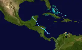 A tropical wave crossed the west coast of Africa on June 20. As the wave moved into the western Caribbean Sea on June 30, a broad cyclonic turning was noted. The system moved over the Yucatán Peninsula on July 1, a day before emerging into the Bay of Campeche as a weak low pressure area. Later on July 2, deep convection became more organized while the system was centered over the southwestern Gulf of Mexico. By 18:00 UTC, the low developed into Tropical Depression Two. Around 04:00 UTC on July 3, the depression made landfall about 40 mi (64 km) south-southeast of Tuxpan, Veracruz, with winds of 35 mph (56 km/h). Eight hours later, it dissipated over the mountains of Mexico.[12] The depression dropped heavy rain on the area amounting to a maximum of 20.37 in (517 mm) at Tanzabaca, San Luis Potosí.[24] In some areas, up to 12.49 in (317 mm) of precipitation fell in 24 hours.[12]