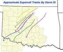 Approximate tracks of the supercells during the outbreak. The supercell that spawned the F5 tornado is marked "A" in green.