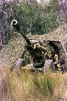 1st Field Regiment was raised on 25 May 1949 at North Head, Sydney. At that time it was the only regular artillery regiment. On the eve of the Vietnam War the Regiment consisted of 101st Field Battery and 105th Field Battery (Independent), both equipped with 105 mm L5 Pack Howitzers, 102nd Light (4.2 inch Mortar) Battery and a Headquarters Battery. In April 1965 the decision was taken to deploy the 1st Battalion, Royal Australian Regiment (1RAR) to Vietnam. This resulted in an expansion of artillery regiments by the addition of a third field battery. 1st Field Regiment's order of battle for deployment to Vietnam was 101st Field Battery, 105th Field Battery, 161st Battery, Royal New Zealand Artillery and Headquarters Battery. 1 RAR deployed to Vietnam in May 1965 with fire support initially provided by 161 RNZA; however, in September 1965 the 105th Field Battery arrived to provide additional fire support. With the expansion of the Australian force to two Battalion Groups in June 1966, the remainder of the Regiment, less 101st Field Battery, deployed to Vietnam accompanied by 103rd Field Battery, under the command of Lieutenant Colonel Richmond Cubis. In addition, six 155 mm M109 self-propelled howitzers from A Battery, US 2/35th Artillery Battalion were permanently attached at Nui Dat.[8]