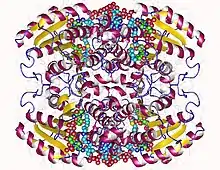 Eukaryotic DECR exists in both the mitochondria (mDECR) and the peroxisome (pDECR, coded by gene DECR2). The enzymes from each organelle are homologous and part of the short-chain dehydrogenase/reductase SDR super-family. mDECR is 124 kDa consisting of 335 amino acids before post-translational modification.[2] The secondary structure shares many of the motifs of SDR, including a Rossmann fold for strong NADPH binding. The protein exists as a homotetramer in physiological environment, but has been shown to also form monomers and dimers in solution.[8]