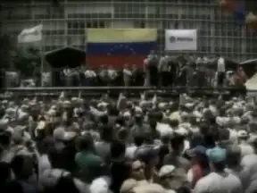 Tensions worsened on 7 April, when Chávez fired PDVSA President Guaicaipuro Lameda Montero and 5 of the 7 members of the board of directors, mocking each one in national television by name and blowing a referee whistle, as if to expel them from a football match.[13][14] On 9 April, a general strike was called by the trade union organization National Federation of Trade Unions (Confederación de Trabajadores de Venezuela, CTV). The proposed strike was in response to Chávez's appointments to prominent posts in Venezuela's national oil company, PDVSA.[15] Two days later in Caracas, up to one million Venezuelans marched in opposition to Chávez.[16][17] After stopping at its original end point, the march continued towards the presidential palace, Miraflores, where government supporters and Bolivarian Circles were holding their own rally. Upon the opposition's arrival, the two sides confronted each other. A shootout started at the Llaguno Overpass, near the Miraflores Palace, and by that evening 19 people were dead. Chávez ordered the implementation of Plan Ávila, a military plan to mobilize an emergency force to protect the palace in the event of a coup.[9] As the plan had resulted in the killing of hundreds of Venezuelans during the Caracazo, military high command refused and demanded he resign.[18] President Chávez was subsequently arrested by the military.[19][20][21] Chávez's request for asylum in Cuba was denied, and he was ordered to be tried in a Venezuelan court.[15]