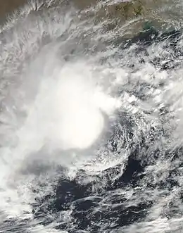 On December 10, an area of convection with an associated circulation persisted about 740 km (460 mi) west of the northern tip of Sumatra, as part of a trough in the region and enhanced by the monsoon. A steady decline in the wind shear allowed the thunderstorms to organize,[23] and a depression formed on December 11.[1] On the next day, the JTWC initiated advisories on Tropical Cyclone 03B. The storm moved generally northwestward, steered by a ridge to the north.[23] The IMD upgraded the system to a deep depression and later cyclonic storm on December 13, and further to a severe cyclonic storm a day later. The agency estimated peak winds of 100 km/h (60 mph), noting spiral convection organizing around the beginnings of an eye feature.[1] The storm also developed well-defined outflow due to an approaching trough from the west. At around 14:30 UTC on December 15, the storm made landfall near False Divi Point in southeastern India,[23] along the coast of Andhra Pradesh. After turning to the northeast over land, the system rapidly weakened, degenerating into a remnant low on December 16.[1]