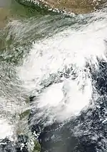 Before the storm made landfall, officials evacuated about 20,000 people.[24] As the storm moved ashore in India, it produced heavy rainfall that reached 190 mm (7.5 in) at Repalle, Andhra Pradesh. Light rains fell in neighboring Tamil Nadu. The rains deluged 61,898.5 ha (152,955 acres) of fields in Andhra Pradesh. The storm damaged or destroyed 9,090 houses,[1] and downed several trees and power lines. Local news reports indicated that the storm produced 10 m (33 ft) waves as it moved ashore,[23] which damaged a ship and forced its crew to be rescued by the Indian Coast Guard.[1] In Andhra Pradesh, the storm killed 83 people and resulted in $28 million (2003 USD) in damage.[1][25] After the storm, the government provided 50,000 rupees (US$1,111) to the family of every storm victim.[24]