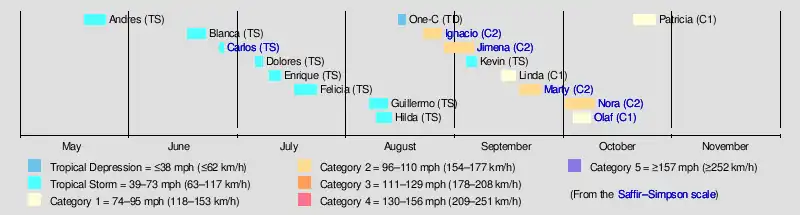 Hurricane Olaf (2003)Hurricane Nora (2003)Hurricane Marty (2003)Hurricane Jimena (2003)Hurricane Ignacio (2003)Tropical Storm Carlos (2003)Saffir–Simpson scale