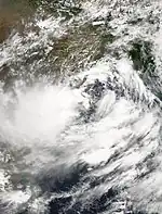 The second storm of the season formed as a depression on May 16 in the central Bay of Bengal. With low wind shear and a surge in the monsoon trough, the storm intensified while meandering over open waters. The storm eventually began a steady northeastward motion due to a ridge to the north over India. While approaching land, an eye developed in the center of the storm, indicative of a strong cyclone. On May 19, the cyclone made landfall along northwestern Myanmar near Sittwe, with maximum sustained winds estimated at 165 km/h (105 mph) by the IMD.[1][2][4] The storm rapidly weakened over land, although its remnants spread rainfall into northern Thailand and Yunnan province in China.[4]