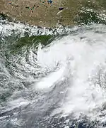 Throughout southeastern Pakistan and northwestern India, thousands of residents were evacuated prior to the cyclone's arrival. In these areas, the storm produced moderate to heavy rainfall, peaking at 145 mm (5.7 in) in Thatta, Sindh, Pakistan.[18] These rains led to flash flooding in several areas. Nine people died in several incidents related to the storm in Karachi.[19] The drainage system of Hyderabad sustained significant damage, leading to several protests and demonstrations by city residents.[20][21] Offshore, 300 fishermen are believed to have gone missing during the storm.[22]