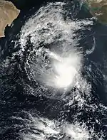 Toward the end of April, an area of convection persisted in the southern Bay of Bengal.[4] It developed into a distinct low-pressure area on May 1 over the body of water, but soon moved westward into India without developing. On May 4, the system emerged from Kerala into the Arabian Sea,[1] and soon after convection rapidly increased. Early on May 5, the JTWC classified the system as Tropical Cyclone 01A about 370 km (230 mi) west-southwest of Kochi, India.[4] On the same day, the IMD began classifying it as a depression, but soon after upgraded it to a deep depression and later cyclonic storm after increased organization.[1] The storm meandered off southwest India for three days due to weak steering currents. During that time, the convection pulsed around the circulation,[4] and the IMD upgraded it to a severe cyclonic storm on May 7 with winds of 100 km/h (60 mph).[1] By contrast, the JTWC only estimated peak winds of 85 km/h (55 mph).[2] Increased wind shear, cooler waters, and dry air rapidly weakened the convection, exposing the center and causing the storm to deteriorate quickly into a depression. On May 10, the system degenerated into a remnant low off Gujarat, without any discernible low-level circulation.[1][4]