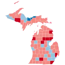 | Shiawassee | 16,881 | 46.06% | 19,407 | 52.95% | 363 | 0.99% | -2,526 | -6.89% | 36,651 |