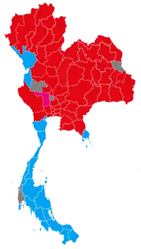 General elections were held in Thailand on 6 February 2005. The result was a landslide victory for the Thai Rak Thai party of Prime Minister Thaksin Shinawatra, which won 377 of the 500 seats in the House of Representatives, with its former coalition partner, the Chart Thai Party taking 25 seats. The opposition Democrat Party of Thailand won only 96 seats and the newly formed Mahachon Party took two seats.