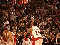 The first half of the season produced mixed results as Toronto struggled towards the .500 mark after a dismal 2–8 start.[8] Bosh's consistent performances however ensured he was named an All-Star starter in the 2007 NBA All-Star Game on 25 January 2007. He received the most votes after LeBron James among all Eastern Conference forwards.[11] A day later, the Raptors hit the .500 mark for the first time since the 2003–04 season after defeating the Boston Celtics at the Air Canada Centre.[12] On 2 February, the Raptors went 24–23, the first time since 2001–02 that they had been over .500 this late in a season.[13] As a result, the Raptors won three NBA Eastern Conference awards for the month of January: Player of the Month (Bosh),[14] Rookie of the Month (Bargnani)[15] and Coach of the Month (Sam Mitchell).[16] On 4 February, the Raptors' 122–110 home win against the Los Angeles Clippers represented a season-high in points for the Raptors.[17] Within the same week, Bosh's career-high 41 points in a win against the Orlando Magic prompted an unheard of event at the Air Canada Centre—chants of "MVP" by the home fans.[18] This chant was repeated in a win against Vince Carter's New Jersey Nets ten days later—to the disbelief of Carter—a game which also saw the team break franchise records for the most home wins and highest home winning percentage entering the All-Star break.[19][20]