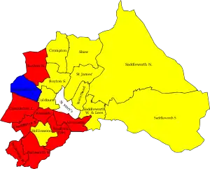 ![]() Map of the 2006 Oldham council election. Liberal Democrats in yellow, Labour in red, Conservatives in blue and Independent in grey. | |||||||||||||||||||||||||||||||||||||||||||||||||||||||||||||