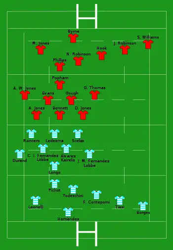 Ian Evans and Alun Wyn Jones started the match to earn their first caps for Wales, while Richard Hibbard and James Hook came off the bench.[11] Evans scored a 45-metre interception try to put Wales in front after Juan Martín Fernández Lobbe had cancelled out Mark Jones' third-minute opening score, but José María Núñez Piossek's try and a pair of penalties from Federico Todeschini meant the home side took a 20–12 lead into half-time, helped by the sin-binnings of Wales back row forwards Gavin Thomas and Alix Popham. Two penalties from Nicky Robinson reduced the margin to two points, but Francisco Leonelli put Argentina 27–18 up with three minutes of the game to go. Hook scored a try in injury time, converted by Robinson, but it proved mere consolation.[12]