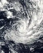On January 26, RSMC Nadi and the JTWC started to monitor a weak tropical disturbance that had developed within a monsoon trough about 290 km (180 mi) to the northeast of Rotuma.[1][30][40] The disturbance initially moved towards the southeast before it recurved and started to move towards the southwest and Fiji during the next day, while gradually developing further in an area of low vertical windshear.[1][41] At 1800 UTC on January 27, the JTWC reported that the disturbance had developed into Tropical Cyclone 15P, while it moved towards the southwest and hugged Vanua Levu's southeastern coast, under the influence of a ridge of high pressure that was located to the southeast of the system.[1][42] 15P's development was hindered while it was located over land, however it did not weaken significantly because it was located in an area of favourable upper-level conditions.[1][42] As the centre of 15P emerged into and passed over the Bligh Waters, convection erupted around the system and for humanitarian reasons, RSMC Nadi named the system, Gene at 0000 UTC on January 28, before 6 hours later reporting that Gene had become a Category 1 tropical cyclone.[1][16]