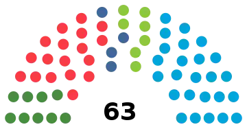 There are six constituencies in Iceland. According to the Law on Parliamentary Elections (nr.24/2000), each constituency is granted 9 seats decided by proportional voting in the constituency, and finally 9 special Leveling seats (either 1 or 2 per constituency, depending on their population size) will work to adjust the result, so that proportionality is also ensured according to the overall number of party votes at the national level. The number of constituency seats shall however be adjusted ahead of the next election, if the fraction of residents with suffrage per available seat in the constituency became more than twice as big in the latest election, when comparing the constituency with the highest fraction against the one with the lowest fraction. In that case a constituency seat shall travel from the constituency with the lowest figure to the one with the highest figure, until the result of the equation comply with the rule. However, the total number of seats (including leveling seats) must never become less than six in any constituency.[2] The box below display the number of available seats in each constituency at the 2007 parliamentary election.[3]