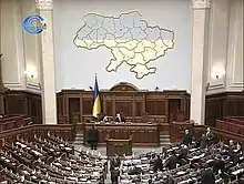At 11 PM the President, in a televised speech to the nation, announced his decree dismissing the parliament and ordering early parliamentary elections to be initially held on 27 May.[5][9] The Rada, passed a motion declaring the decree unconstitutional, in defiance of the president's decree continued to function,[10] issued orders preventing funds allocation for elections,[11] and canceled the order assigning election commission members.[12] The cabinet, supporting the parliament, refused to allocate funds for the new election.[13]