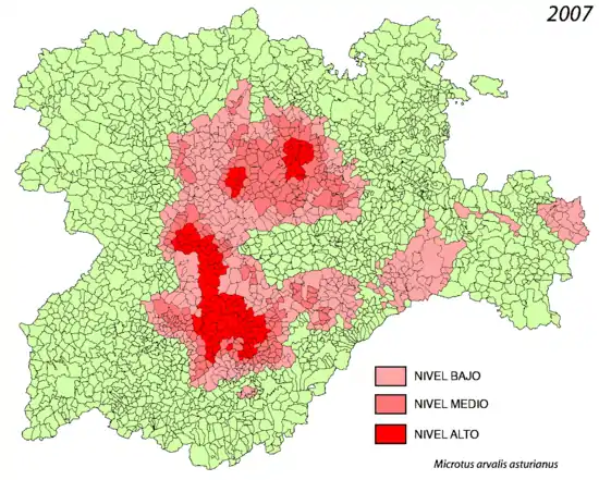 Indeed, research carried out in the 1970s by the biologist José Rey located this species only on the southern slopes of the Cantabrian mountain range and in the Sierra de Albarracín and Sierra de Javalambre. The data were corroborated by other specialists.[25] Apparently, the species could have come down some river valleys in the north where alfalfa groves were abundant, although the information is not sufficient.[26] But since the beginning of the 1980s there were already reports of some Microtus arvalis in the province of Valladolid.[27] An expansion of this magnitude is unprecedented among the known ecological phenomena in the Spanish Northern Plateau.