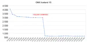 Trading in shares of six financial companies on the OMX Nordic Iceland Exchange was suspended on 6 October by order of the FME.[83] On Thursday 9 October, all trading on the exchange was frozen for two days by the government "in an attempt to prevent further panic spreading throughout the country's financial markets". The decision was made to do so due to "unusual market conditions",[84] with share prices having fallen 30% since the start of the month.[85] The closure was extended through Monday 13 October due to continuing "unusual market conditions".[86]