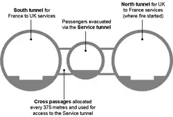 When the train stopped in the tunnel due to a fire, the procedure was that the smoke had to be removed by the high powered ventilation before an evacuation could be allowed. However, when the train came to a halt, people saw the smoke and some panicked, broke a window and started evacuating on their own. The evacuation procedure is now shown in nine languages in the lorry driver's club car. Eurotunnel was also concerned because it took 75 minutes before the fire services started to tackle the blaze and that the ventilation was on during this time, fanning the fire and increasing the damage.[10][20] After tests in April 2010, Eurotunnel built four "fire-fighting stations" in the tunnel. When a fire is detected on a train, it continues to the next station, where passengers and crew are evacuated into the service tunnel while an automatic system puts the fire out with water mist. These stations became operational in autumn 2011[21] and were tested in January 2012.[22]