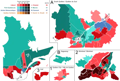 Popular vote by riding. As this is an FPTP election, seat totals are not determined by popular vote, but instead via results by each riding. Click the map for more details.