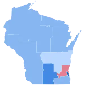 Obama won Wisconsin by a comfortable 13.91% margin of victory. Obama carried the heavily Democratic cities of Milwaukee and Madison by large margins, winning above two-thirds of the vote, along with some traditionally Republican cities like Green Bay and Appleton.[22] In Dane County, he won almost 73% of the vote, and carried 67.3% in Milwaukee County. This was consistent with Obama's pattern of strong performances in the states bordering Illinois. Obama's best performance, at 86.81%, was in the small county of Menominee, which is 87% Native American.[23] The state's Republican base essentially melted; John McCain only carried 13 of the state's 72 counties, a devastating defeat. McCain did best in the Milwaukee suburbs like Waukesha and Ozaukee counties, with his best performance in Washington County where he received 64.14% of the vote. He only won five counties in the Northern part of the state, all of which by rather narrow margins. Wisconsin would not vote for a Republican candidate for president until it voted for Donald Trump in 2016, though it would flip back to the Democratic column in 2020 with Joe Biden back on the ballot.