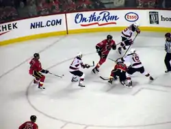 Three losses in four games, capped by a 5–0 defeat against the Boston Bruins on March 27 left the Flames six points out of the eighth and final playoff spot with seven games remaining.[49] The team also lost second-line centre Daymond Langkow after he was taken off the ice on a stretcher in Minnesota after being struck in the back of the neck by a slapshot.[50] However, a 5–3 road victory against the Eastern Conference leading Washington Capitals and a 2–1 home win against the Phoenix Coyotes, coupled with the Colorado Avalanche losing six of their final seven games to end the month of March, left the Flames two points behind the Avalanche heading into April.[49]