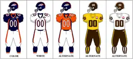 7. 1 2 These two games were among the 16 that the NFL designated as "AFL Legacy Games," in honor of the 50th anniversary of the AFL. The Broncos wore their throwback uniforms during those two games, as did the Patriots and Chargers. The Broncos wore the yellow jerseys (with brown numerals) against the Patriots, and the white jerseys (with brown numerals) at the Chargers.[6]