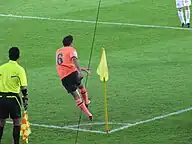 Two moments of the match, with both teams taking a corner kick: Juan Sebastián Verón for Estudiantes on the left and Xavi for Barcelona on the right.