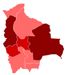 As of 15 September, according to Agencia Boliviana de Información the number of cases is over 1,600 .[14] The department with most cases is Santa Cruz with more than 900 cases. Owing to the increasing number of cases Bolivian authorities have given students two additional weeks of vacations, and are canceling concerts and other big events. Viru Viru International Airport (Santa Cruz) authorities are checking every international and national passenger arriving. The Daddy Yankee concert is already suspended and now expected for August. The only department with no cases is Pando, and it is the least populated department. Two deaths were confirmed on 10 July, One of a six-year-old girl and one of a 50-year-old man, both from Santa Cruz. Most museums, cinemas and theaters are closed in Santa Cruz. Most restaurants are open and the biggest cinema in Bolivia, Cine Center, is open. The third death has been confirmed on 16 July. It was the first confirmed death in the department of La Paz. Pando, the only department in Bolivia, previously without the flu, has now some suspected cases. As at 21 July Bolivia has five confirmed deaths. The number of cases and deaths are increasing every day. Recently deaths have been confirmed in Tarija and Potosi making the numbers of deaths rise to nine. Confirmed deaths in El Alto and Cochabamba raised the numbers of deaths to 13. Some private and public schools have closed in Santa Cruz after finding students infected with the flu. The actual number of deaths is now 35.