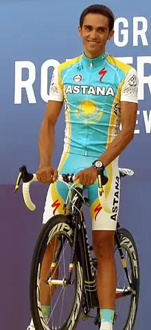 ![]() Alberto Contador at the 2010 Tour de France team presentation. | |