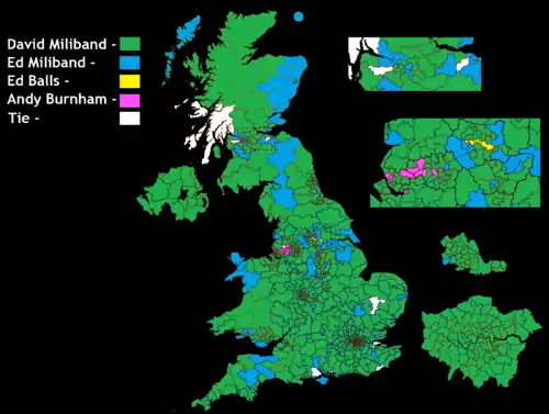 The map below shows the results of the Constituency Labour Parties first round preferences in the leadership election by constituency, before votes were transferred due to eliminations. David Miliband took the most constituencies, winning 577 in total. He was followed by Ed Miliband who took sixty-seven constituencies. Andy Burnham won eight seats, all in north-west England, Ed Balls took two constituencies (his own, Morley & Outwood, and that of his wife, Yvette Cooper, Normanton, Pontefract and Castleford), and Diane Abbott won no constituencies. All ties with the exception of Wigan (Burnham and David Miliband) were between David and Ed Miliband. Northern Ireland was counted as one constituency.[42]