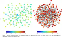 Network snapshots before (left) and during (right) the simulated flash crash. The last 400 transactions in the order-book are plotted by connecting the HFT agents who transact with each other. The node color indicates the inventory size of the HFT agent. When the market operates normally (left subplot), almost all of the HFT agents are in control of their inventory (greenish color). In crash period (right), most of the HFT agents gain large inventories (red) and the network is highly interconnected: over 85 percent of the transactions are HFT-HFT.[53]