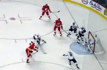 A Flames victory over the New Jersey Devils on January 10, 6–3 despite being outshot 38–14, was Calgary's seventh consecutive win on home ice and moved them back above .500.[28] The Flames' home winning streak was ended at eight following a loss to the Los Angeles Kings on January 14, the first time the Kings won in Calgary in regulation time in seven years.[29] Struggling on offence throughout the month, the team ended January with a record of 5–6–1 and remained outside of a playoff position.[30]