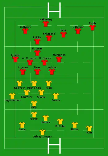| Try: Higginbotham 14' c Genia 40' c McCabe 66' c Con: Barnes (3/3) 15', 42', 67' Pen: Barnes (1/3) 8' Drop: Barnes (1/1) 49' | Report[4] | Try: Cuthbert 57' c Con: Halfpenny (1/1) 59' Pen: Halfpenny (4/4) 21', 45', 55', 62' |