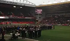 March started in a similar fashion, with a 1–0 away win at MK Dons with Stefan Scougall scoring the only goal.[139] This was followed by a 2–0 home victory over Peterborough United on 4 March with goals from Porter and Davies, his first for the club.[140] Later that week, with a number of the squad having picked up injuries and a busy fixture list ahead, Kieron Freeman joined United on a one-month loan from Derby County to act as defensive cover,[141] before Nigel Clough was named as the League One 'Manager of the Month' the following day.[142] Returning to FA Cup action, United booked their place in the semi-finals at Wembley Stadium after they beat Charlton Athletic 2–0 at Bramall Lane on 9 March.[143] United played their third home game in a row three days later, and a 1–0 scoreline was enough to condemn Carlisle United to a league defeat, meaning the Blades had registered their tenth straight win in all competitions.[144] United's winning run was halted in the next match however, as they were held to a goalless draw away at Preston North End.[145] On 21 March Callum McFadzean joined Burton Albion on a one-month loan,[146] while striker Shaun Miller joined Shrewsbury Town a day later, agreeing a loan until the end of the season.[147] United's next league fixture was a gala fixture as the club celebrated 125 years since its formation, although the party was soured as Wolverhampton Wanderers inflicted the club's first defeat in eleven matches, winning 2–0 at Bramall Lane.[148] After Elliott Whitehouse was allowed to join Alfreton Town on loan,[149] United returned to winning ways with a 2–0 away victory over Crawley Town thanks to two goals from Conor Coady.[150] On the deadline for loan deals, Sean McGinty joined Rochdale for the remainder of the season.[151] March's final fixture saw United lose at Swindon Town, with a late goal condemning them to a 2–1 defeat.[152]