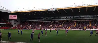 With the winter transfer window due to open, United opted to allow striker Lyle Taylor to join Scottish Premiership side Partick Thistle for the remainder of the season.[103] Taylor was quickly followed by fellow striker Marlon King whose short-term contract was terminated at the end of the year.[104] Youngster Jahmal Smith joined Harrogate Town on a youth loan.[105] Having picked up an injury during the game against Oldham, Aidan White cut short his loan spell to return to Leeds for treatment.[106] United's unbeaten run did not last into the new year, as despite leading 1–0 at half time, they were beaten 2–1 away at Walsall.[107] As January began Aaron Barry returned from a successful loan spell at Dumbarton having played over 20 times for the Sons,[108] before United knocked Premiership side Aston Villa out of the FA Cup following a 2–1 third round at Villa Park.[109] The following week saw a flurry of arrivals and departures as Elliott Whitehouse returned from his loan spell at York City,[110] whilst Joe Ironside returned from Halifax Town, Callum McFadzean returned from Chesterfield and youngster Jahmal Smith joined Harrogate Town on a months loan.[111] Conor Coady then extended his loan with United until the end of February,[112] and Darryl Westlake extended his loan with Mansfield Town until the end of the season.[113] The following day Malachy Brannigan was unveiled as the club's new managing director, reuniting with Nigel Clough, with whom he had worked at Derby County.[114] The week concluded with United signing Billy Paynter on loan for the rest of the season from South Yorkshire rivals Doncaster Rovers,[115] whilst Marcus Williams left permanently for Scunthorpe United on a free transfer,[116] and Sean McGinty joined Northampton Town on a months loan.[117] For the second league fixture in a row United let a lead slip to lose 2–1 at Notts County,[118] and then as Nigel Clough continued to revamp the squad, Febian Brandy was allowed to rejoin Walsall on loan for the remainder of the season, only six months after leaving the West Midlands club,[119] and Florent Cuvelier joined Port Vale for a similar period.[120] In their next match, United drew 2–2 at home with Yorkshire rivals Bradford City despite having held a two-goal lead at half time.[121] 24 January saw United make a number of signings, bringing in John Brayford on loan for the remainder of the season from Cardiff City, signing Stefan Scougall from Livingston for an undisclosed fee,[94] and agreeing a loan-swap deal with Blackpool that saw Bob Harris sign for a month with United, with Tony McMahon moving in the opposite direction.[122] In the fifth round of the FA Cup United held Premier League Fulham to a 1–1 draw at Bramall Lane, despite being reduced to ten men for most of the second half following Michael Doyle's red card.[123] On 30 January, McMahon agreed a permanent switch to Blackpool, after the west-coast club decided to take up the remainder of his contract.[124] The following day, in the final hours of the transfer window, United agreed a similar deal with Bob Harris, taking over the remainder of his contract from his former club.[102]