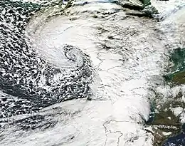 Late November and early December saw an area of high pressure positioned to the west of Britain and Ireland, this directed the westerly path of weather systems moving over the Atlantic to the north of the UK, along which the storms developed before impacting across the Nordic countries. Lows moving to the north of the United Kingdom meant that November was fairly dry for the country.[1] December saw long periods of calm conditions in France also with dry and sunny weather predominating. A change in the weather regime began as active depressions brought strong rain and snowfall to the mountains towards the month end. Until 13 December, France (and UK and Ireland) were protected by a powerful anticyclone stretched from the Maghreb to the British Isles, which deflected the Atlantic storm track north into Scandinavia.[4] The Nordic nations were affected by a series of storms, including Hilde (17 November),[5] Oskari (1 dec),[6] Xaver (5–7 Dec), Ivar (12 Dec)[5] and Zaki and Adam (14–15 Dec). Cyclone Xaver is predominantly known for the North sea storm surge of 5 December in the UK. The high pressure over Britain, Ireland and the Atlantic moved east during mid December, opening the way for areas of low pressure to reach western Europe. During mid-December a strong temperature gradient established over eastern North America (temperatures in New York 21 °C [70 °F], Montreal −7 °C [19 °F]), which enhanced the jetstream in the North Atlantic.[7][8] The lows moved under this powerful jet stream where they explosively deepened before reaching Western Europe.[9]