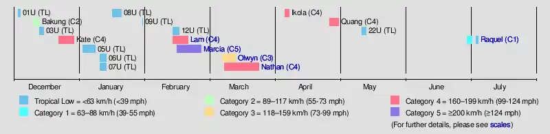 | Kate | 21 - 30 December | Category 3 severe tropical cyclone | 150 km/h (90 mph) | 967 hPa (28.56 inHg) | None | None | None | [50] | |