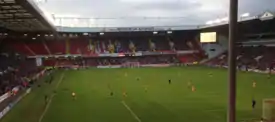 October started with Paddy McCarthy joining United from Crystal Palace on an initial one-month loan.[44] On 4 October, United lost 3–2 away at Chesterfield with Michael Higdon receiving a red card.[45] The Blades' next match was in the Football League Trophy, winning 2–1 away at Hartlepool United on 7 October,[46] two days before Diego De Girolamo joined York City on a short-term loan deal.[47] Back in the league United needed late goals to come from behind again to record a 2–2 draw against Leyton Orient.[48] Seven days later they were 2–0 victors in a televised away fixture against Bradford City as defender Bob Harris scored his first goal in the club's colours and Marc McNulty netted his fifth of the season.[49] Three days later, United made it two wins on the bounce with a 2–0 home win against Yeovil Town.[50] On 23 October, Andy Butler was sent out on loan to home-town club Doncaster Rovers until January.[51] United made it three wins and three clean sheets in three games with a 1–0 victory away at Crewe Alexandra on 25 October as Stefan Scougall scored his first goal of the season.[52] United rounded off October with a 2–1 away victory over Milton Keynes Dons thanks to a late brace from Michael Higdon, which sent United to the last eight of the League Cup in the fifth round.[53]