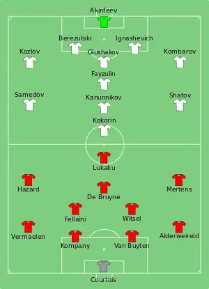 Algeria took a one-goal lead in the first half after Sofiane Feghouli converted a penalty kick, awarded for a foul on him by Jan Vertonghen. Belgium came back with two goals in the second half, both scored by substitutes.[2] The equaliser was scored by Marouane Fellaini, heading in a cross from the left by Kevin De Bruyne, followed by the game winner scored by Dries Mertens from a pass by Eden Hazard.[3]