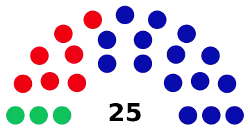 Last election 10 seats; 38.99% 10 seats; 36.88% 5 seats; 21.61%