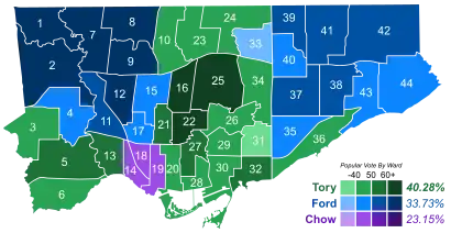 The election was won by former Progressive Conservative Party of Ontario leader and 2003 mayoral runner-up John Tory, who defeated Ford's brother, city councillor Doug Ford, and former Trinity—Spadina MP Olivia Chow.[2] More than 980,000 Torontonians cast ballots in this election – a record turnout of around 55 percent.[3][4]