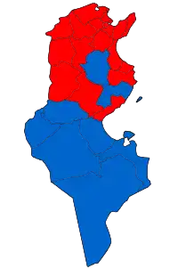 Map showing the plurality of votes of the parties in each Tunisian governorate.