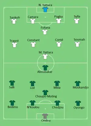 Cameroon took the lead in the 13th minute, when Benjamin Moukandjo's corner evaded everybody and hit the goalkeeper to go into the net. Guinea equalized in the 42nd minute, as Ibrahima Traoré received a pass from Issiaga Sylla, and shot home from outside the penalty area.[14][15]