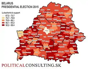 According to the Central Election Commission, more than 36% of voters used the early voting process, higher than in previous years.[24] Overall turnout was 87.22% – highest in Vitebsk Region at 91.08% and lowest in Minsk at 74.38%.[25][26] Alexander Lukashenko won the election with 83.47% of the vote.[25][27]