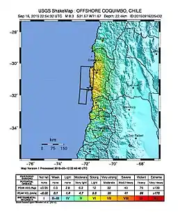 - 1 2 3 4 5 6 7 8 "M 8.3 - 48km W of Illapel, Chile". United States Geological Survey. Retrieved September 16, 2015.