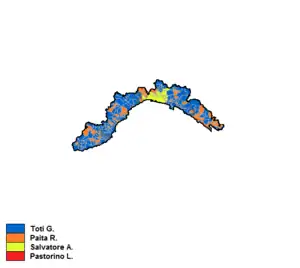| Giovanni Toti | 226,710 | 34.45 | 7 | Northern League Liguria | 109,209 | 20.25 | 5 | ||