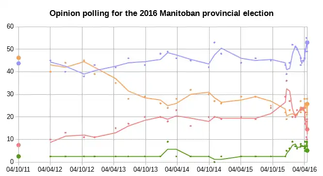 The election was relatively unique within Canadian politics, in that opinion polling indicated that most voters were basing their decision on the local candidate in their riding or the party platform, not the performance of the leader. In most Canadian elections, such as the 2016 Saskatchewan election, the behaviour of the party leader was a stronger motivator for constituents when voting;[7] in the context of the Manitoba election, however, polling found that none of the three main party leaders was particularly well-liked or trusted by the electorate.[8] Although Pallister fared best with 33 per cent support in public opinion polling on the question of preferred premier, even he finished only one point ahead of "none of the above" at 32 per cent.[8]