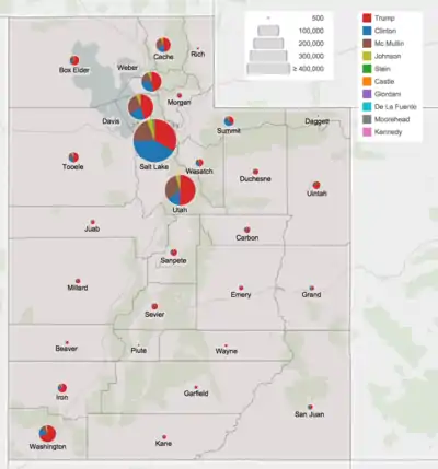 Utah gave the Republican nominee a 45 percent plurality and thus awarded him six electoral votes. This was the lowest percent of the vote Trump received in a state he won in 2016.[26][27] Trump received a much lower percentage of the vote in Utah than did Mitt Romney in 2012.[28] In particular, Trump underperformed Romney by over 30 percentage points in the Provo-Orem, Logan, and Ogden metropolitan areas. Meanwhile, Clinton improved on Obama's performance in all of these areas.[29] Trump received only 45 percent of the vote among Utah members of the LDS Church, barely half the proportion that Romney won in 2012. This was also much lower than the 61 percent of the LDS Church's vote Trump received nationally.[30]